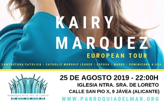Concierto de Kairy Marquez, llegada desde Atlanta (EEUU). Es una de las voces en auge de la música católica en español. En su primera gira por Europa, uno de sus destinos será nuestra localidad. La entrada es gratuita. Las personas que lo deseen podrán aportar su donativo voluntariamente para colaborar con los gastos y apoyar el evento.